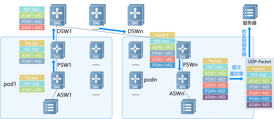 源服务器发送报文给目标服务器,途径拥塞的汇聚交换机