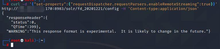 curl -d '{ "set-property" : {"requestDispatcher.requestParsers.enableRemoteStreaming":true}}'http://xxx.xxx.xxx.xxx:8983/solr/fd_20201221/config -H 'Content-type:application/json'
