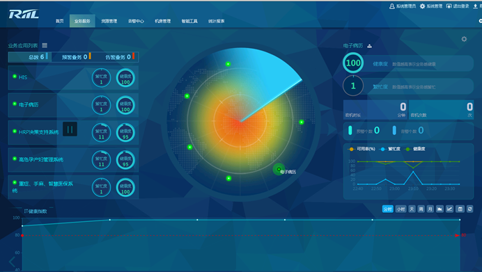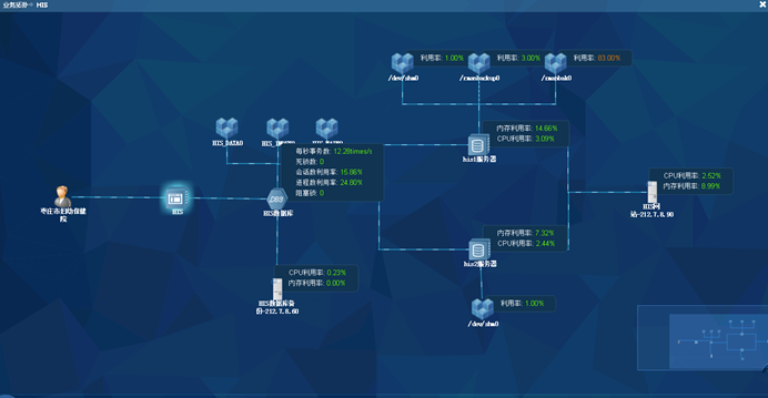 通过一个可视化平台,让信息化管理者可以完整的实时看到两个院区各类IT资源的运行状况,同时能够对医院HIS、LIS、PACS等核心业务系统做到数据监测。