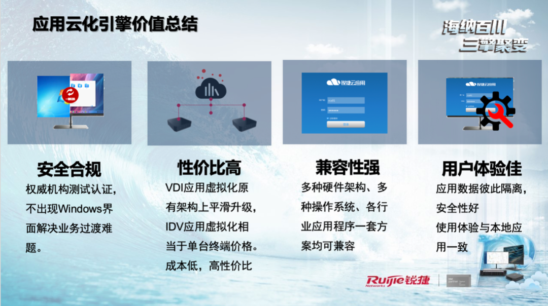 在某省生态环境厅的云桌面建设中,采用了“桌面云化引擎+应用云化引擎”双驱动,集中解决了客户因更换Linux操作系统后,而导致的原有OA及业务系统不能适配的问题,针对办公、人事管理、流程审批等轻应用实现了快速的迁移改造配适,而针对难以短期内完成适配的污染控制管理、环境监理管理等重型复杂应用系统,则是通过应用虚拟化技术,让未适配的Windows应用运行在Linux操作系统上,简化了云化流程,缩短了迁移时间,极大的提升了用户的使用体验。