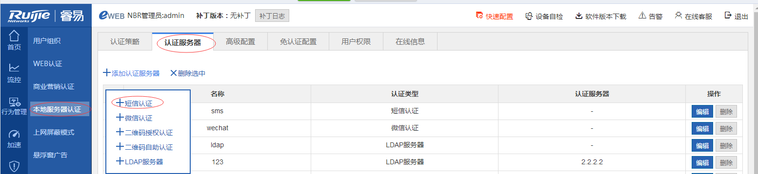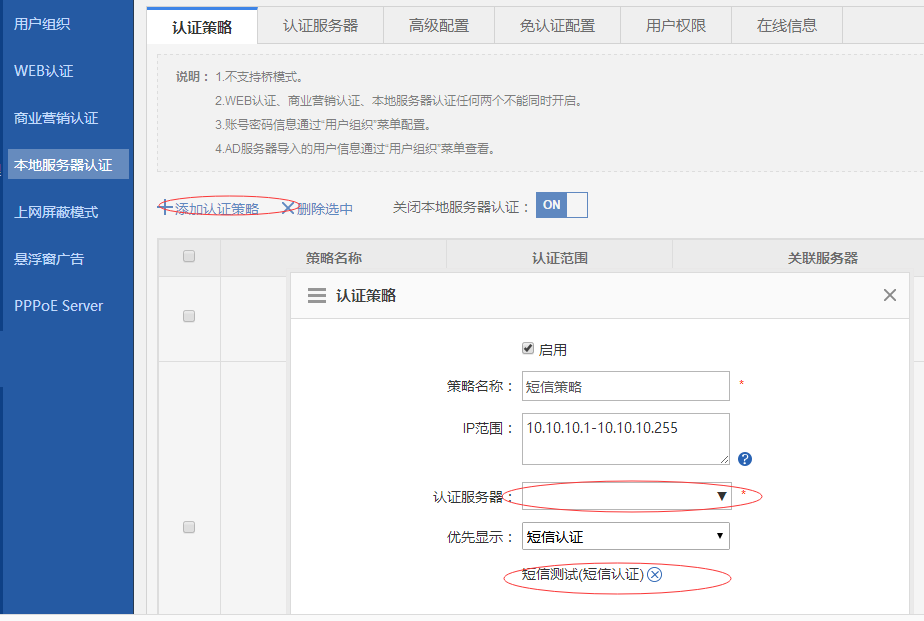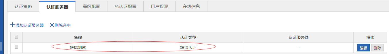 进入设备WEB页面,选择“用户”—》”本地服务器认证”, 添加短信认证服务器