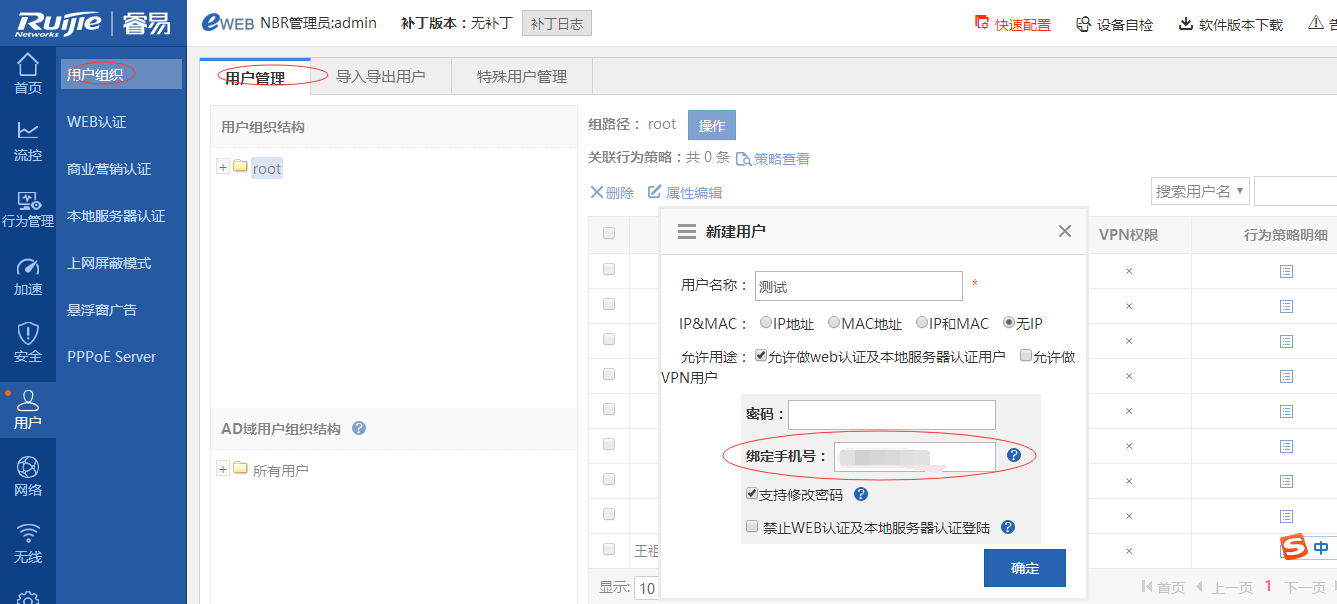 预先输入手机号模式是指手机号预先在设备端进行添加后才能进行短信认证。 添加手机号通过”用户”—》“用户组织”中进行配置