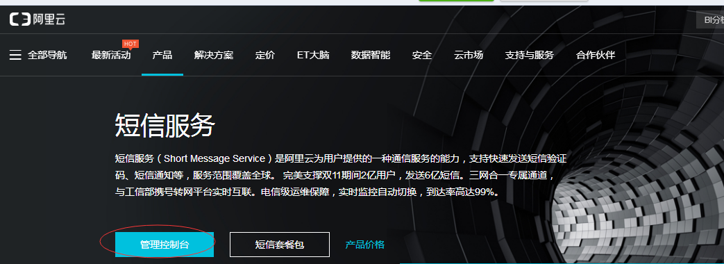 注册完成后登陆阿里云平台,通过导航菜单进入短信平台配置页面