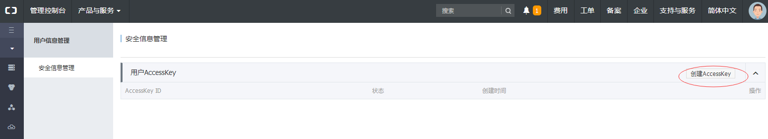 选择创建AccessKey,按照页面步骤完成创建同时保存AccesssKey信息