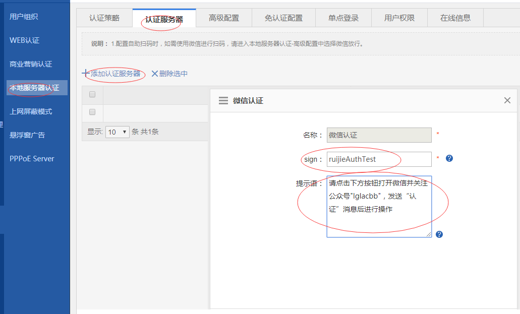 在公众号中需要配置一个认证的url,用户通过访问该url后可以跳转出二维码。 当前设备默认使用http://11.11.11.11/wx。 在公众号里需要配置成如下形式: