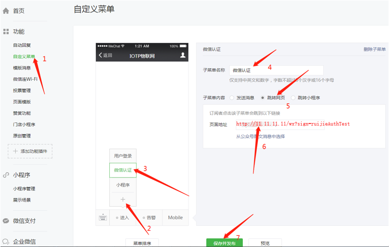 创建自定义菜单入口,设置一个菜单,地址栏地址为http://11.11.11.11/wx?sign=ruijieAuthTest