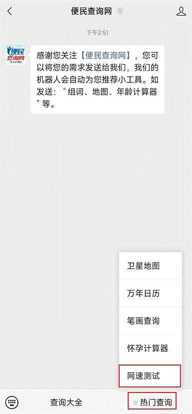 (2)    进入“便民查询网”公众号,点击右下方的“热门查询” -> “网速测试”。